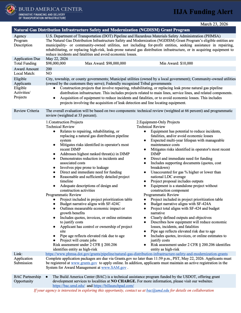 The U.S. Department of Transportation’s Pipeline and Hazardous Materials Safety Administration (PHMSA) has announced a Notice of Funding Opportunity (NOFO) for the Natural Gas Distribution Infrastructure Safety and Modernization (NGDISM) Grant Program, which provides funding to support the repair, rehabilitation, and replacement of high-risk, leak-prone natural gas distribution infrastructure. The program is designed to improve safety, reduce incidents and fatalities, and prevent economic losses by helping public and community-owned utilities modernize aging systems and acquire advanced equipment such as leak detection and line locating technologies.