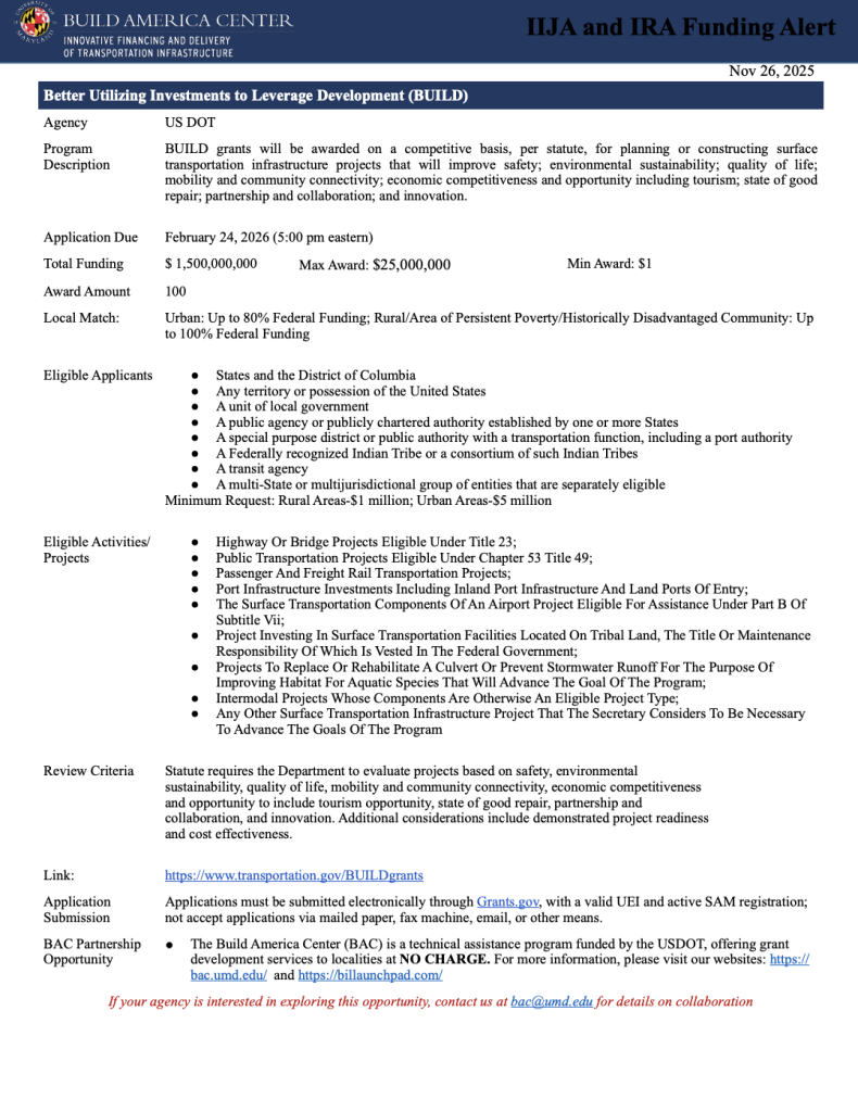 The U.S. Department of Transportation has released a new funding opportunity under the Better Utilizing Investments to Leverage Development (BUILD) program, offering $1.5 billion to support transformative surface transportation projects across the country. Awarded competitively, BUILD grants prioritize initiatives that enhance safety, environmental sustainability, quality of life, mobility, community connectivity, economic competitiveness, and innovation. Eligible applicants include states, local governments, transit agencies, Tribal nations, port authorities, and multijurisdictional partnerships, with funding available for a wide range of project types—from highways and bridges to public transit, rail, ports, and intermodal infrastructure. Applications are due February 24, 2026, and federal match requirements vary by community type. As always, the Build America Center provides no-cost technical assistance to help communities navigate this opportunity and develop strong applications.