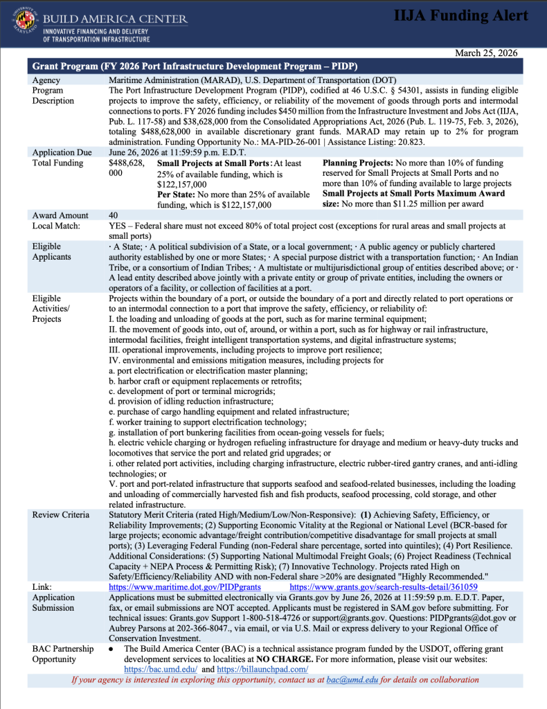 The U.S. Department of Transportation’s Maritime Administration (MARAD) has announced a Notice of Funding Opportunity (NOFO) for the FY 2026 Port Infrastructure Development Program (PIDP), a competitive grant program that supports projects aimed at improving the safety, efficiency, and reliability of goods movement through ports and their intermodal connections. Funded through both the Infrastructure Investment and Jobs Act (IIJA) and the Consolidated Appropriations Act, 2026, the program makes approximately $488.6 million in total funding available, with at least 25 percent reserved for small projects at small ports. Eligible applicants include states, local governments, port authorities, Tribal entities, and multijurisdictional partnerships, as well as public entities applying jointly with private partners.