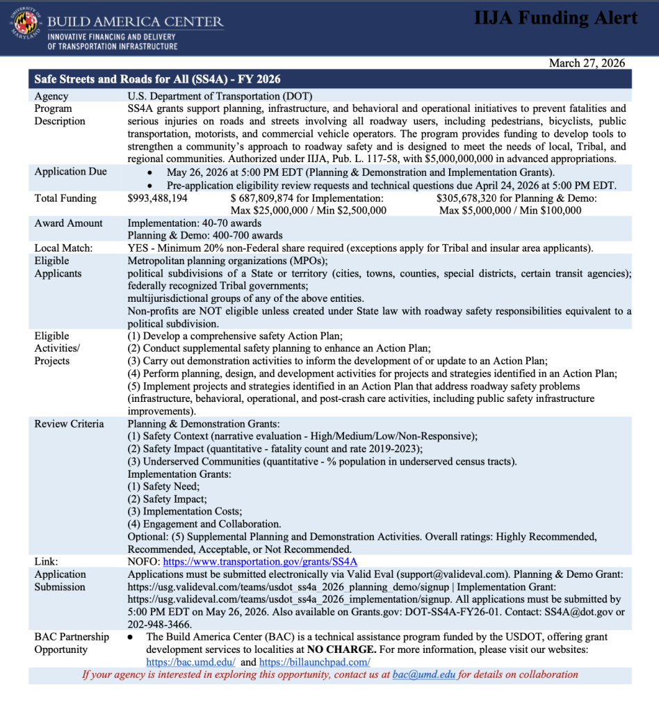 Applications are due May 26, 2026, with earlier deadlines for eligibility reviews and technical questions, and must be submitted electronically through the Valid Eval platform. Proposals will be evaluated based on criteria such as safety need and impact, cost effectiveness, and stakeholder engagement. As always, the Build America Center (BAC) offers no-cost technical assistance to help applicants navigate federal funding opportunities and develop competitive applications.