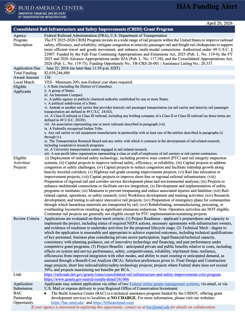 The U.S. Department of Transportation’s Federal Railroad Administration (FRA) has announced a Notice of Funding Opportunity (NOFO) for the Consolidated Rail Infrastructure and Safety Improvements (CRISI) Program, a competitive grant program that supports projects aimed at improving the safety, efficiency, and reliability of passenger and freight rail systems across the United States. The program provides significant federal funding for a wide range of activities, including track upgrades, grade crossing improvements, rail line relocations, deployment of new technologies, and workforce development initiatives that enhance rail safety and performance. Eligible applicants include states, local governments, rail carriers, metropolitan planning organizations, Tribal governments, and other public or private entities, with opportunities for partnerships across sectors. Applications must be submitted through Grants.gov by the stated deadline, and proposals will be evaluated based on criteria such as safety benefits, project readiness, cost effectiveness, economic impact, and alignment with national rail and transportation priorities.