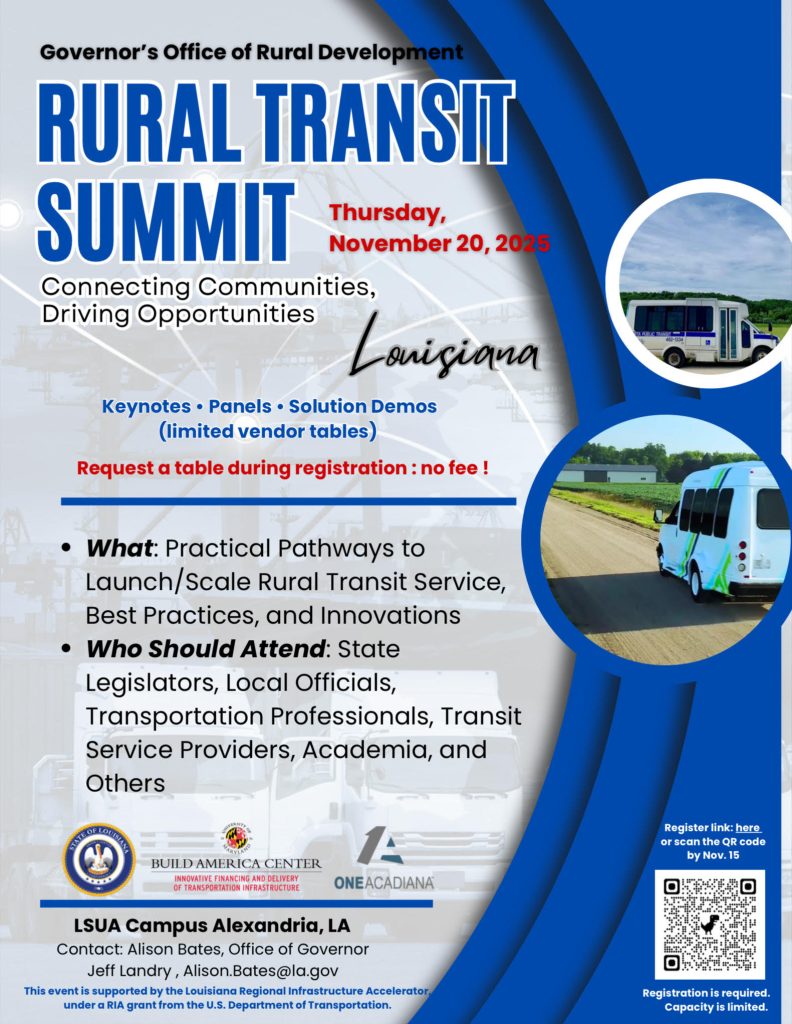 The Build America Center (BAC) and the Governor’s Office of Rural Development are co-hosting a Rural Transit Summit on November 20th at LSU Alexandria, bringing together leaders and practitioners committed to strengthening mobility, access, and opportunity in rural Louisiana.